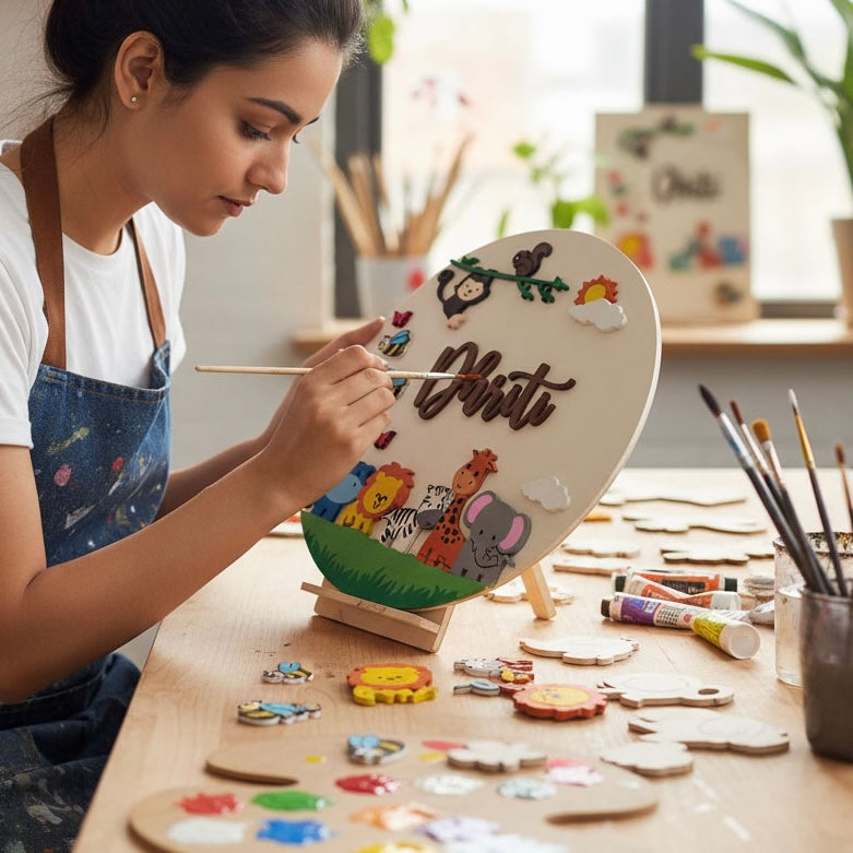 Animal Themed Hand-Painted Wooden Round Kids Name Plate - Design 4