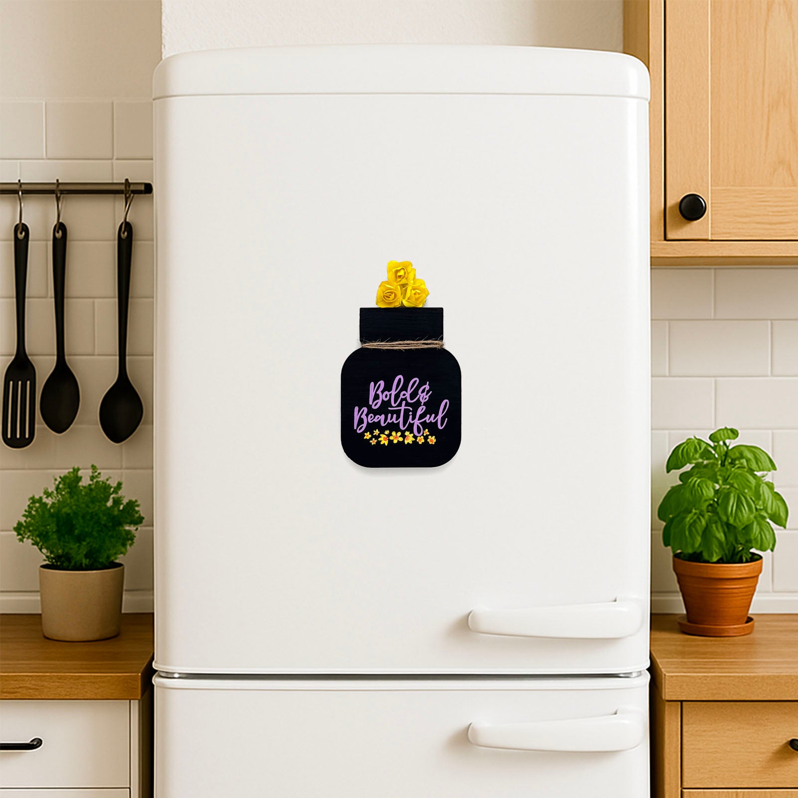 - This fridge magnet is adorned with beautiful artificial flowers, adding a vibrant, nature-inspired touch to your kitchen décor.