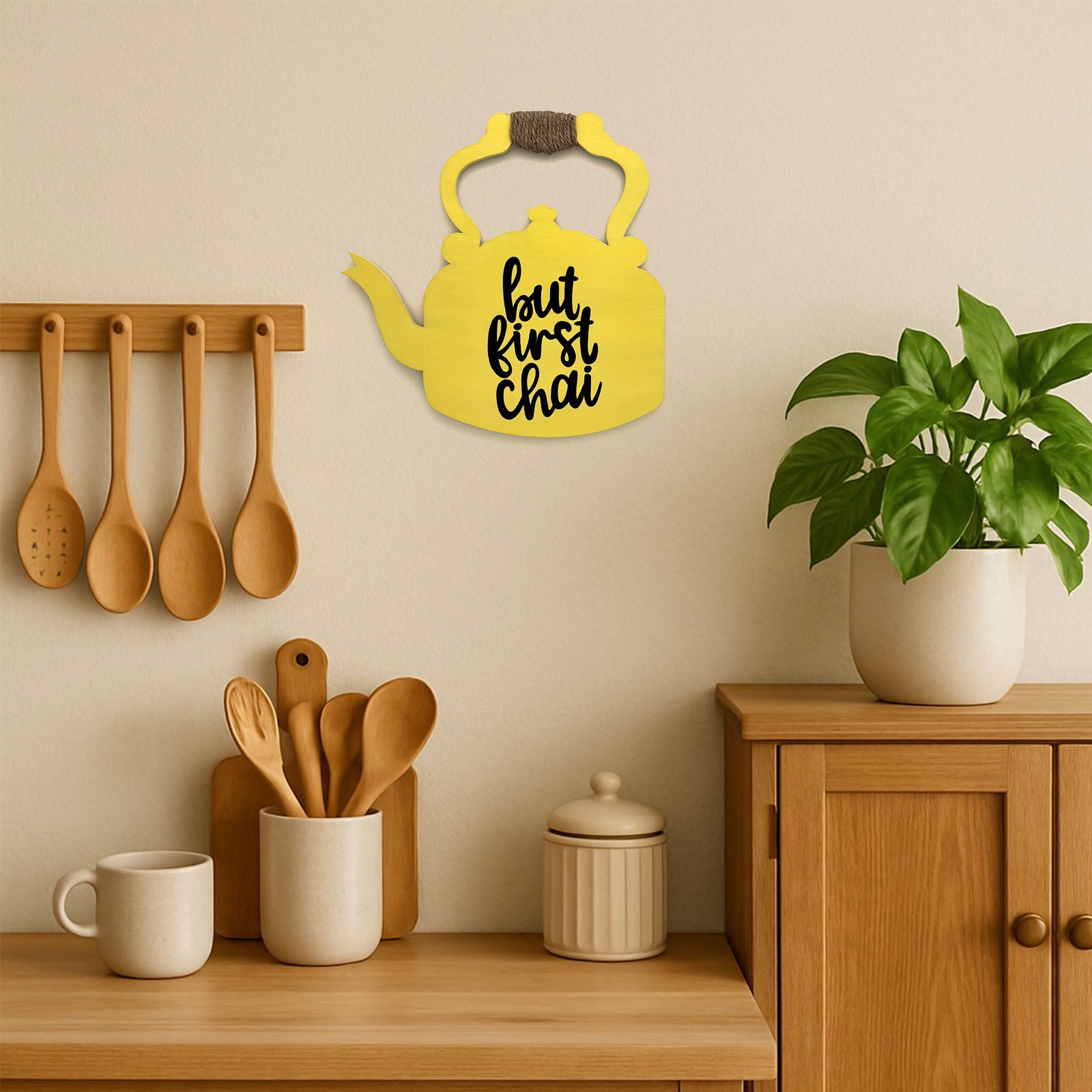 But First Chai Hand-Painted Wooden Kettle Kitchen Wall Hanging - Yellow