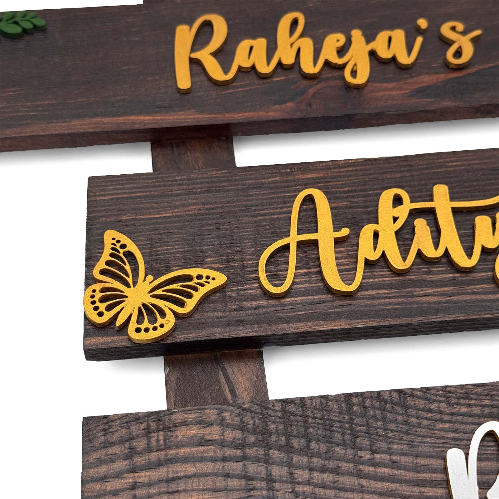 Butterfly & Flower Themed Hand-Painted Wooden Three Plank Name Plate For Home - Wooden Finish