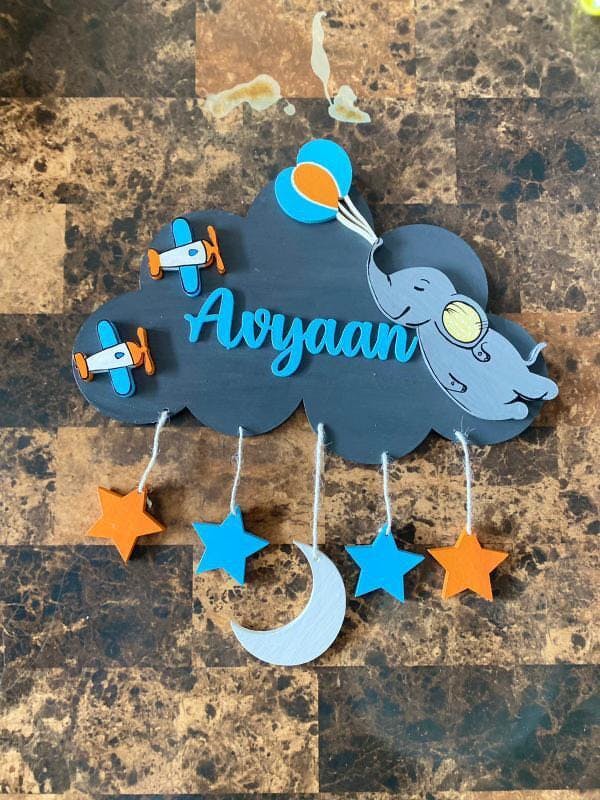 - Add a charming touch to your kid’s room with this adorable cloud and elephant-themed nameplate.