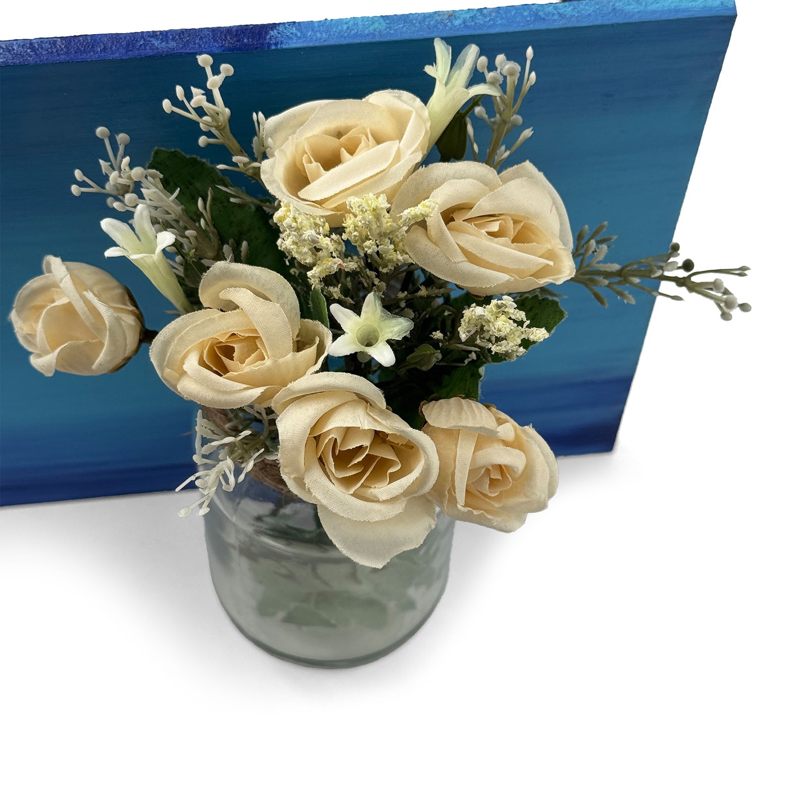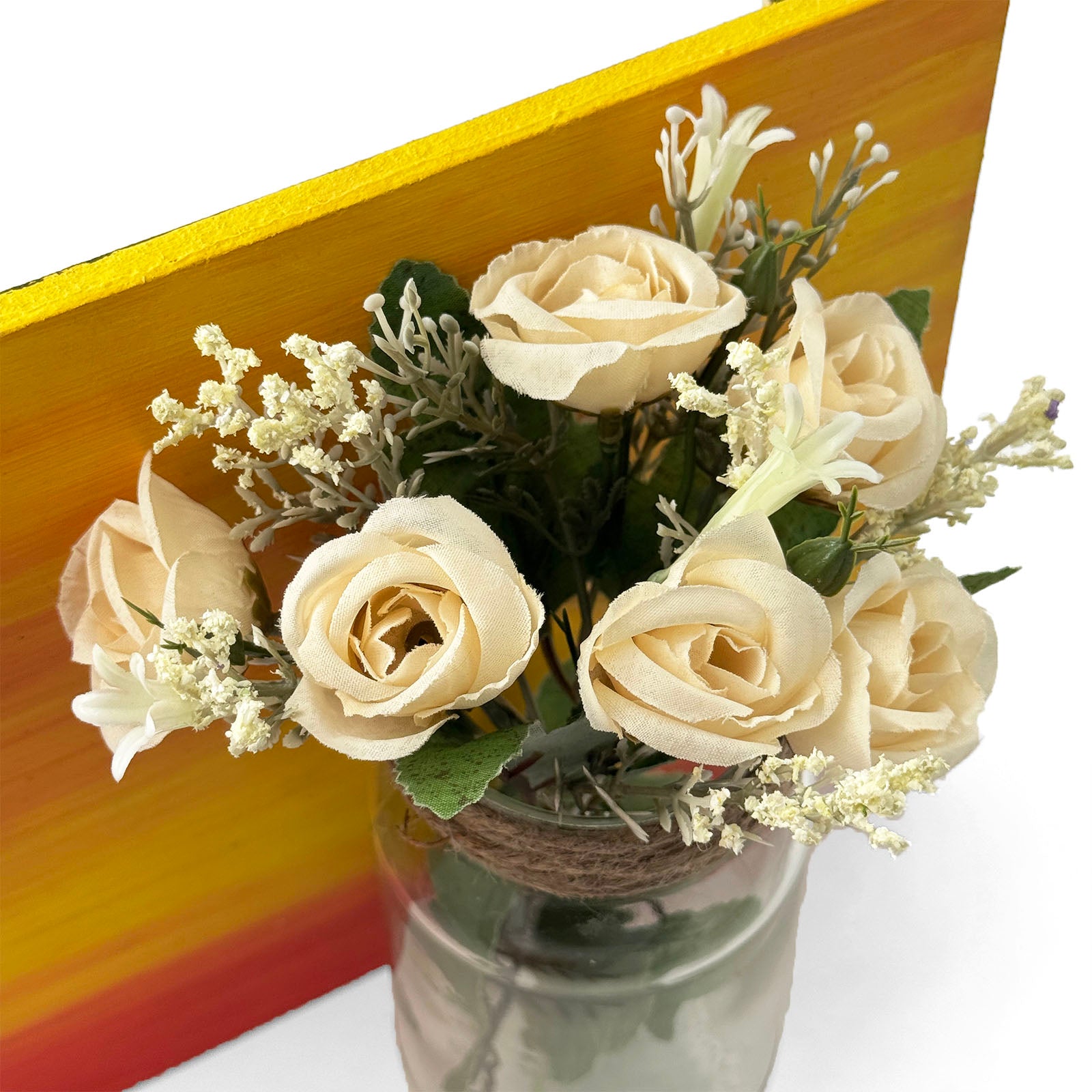 - This nameplate includes a glass jar of beautiful artificial flowers which will bring life and color to your space.
