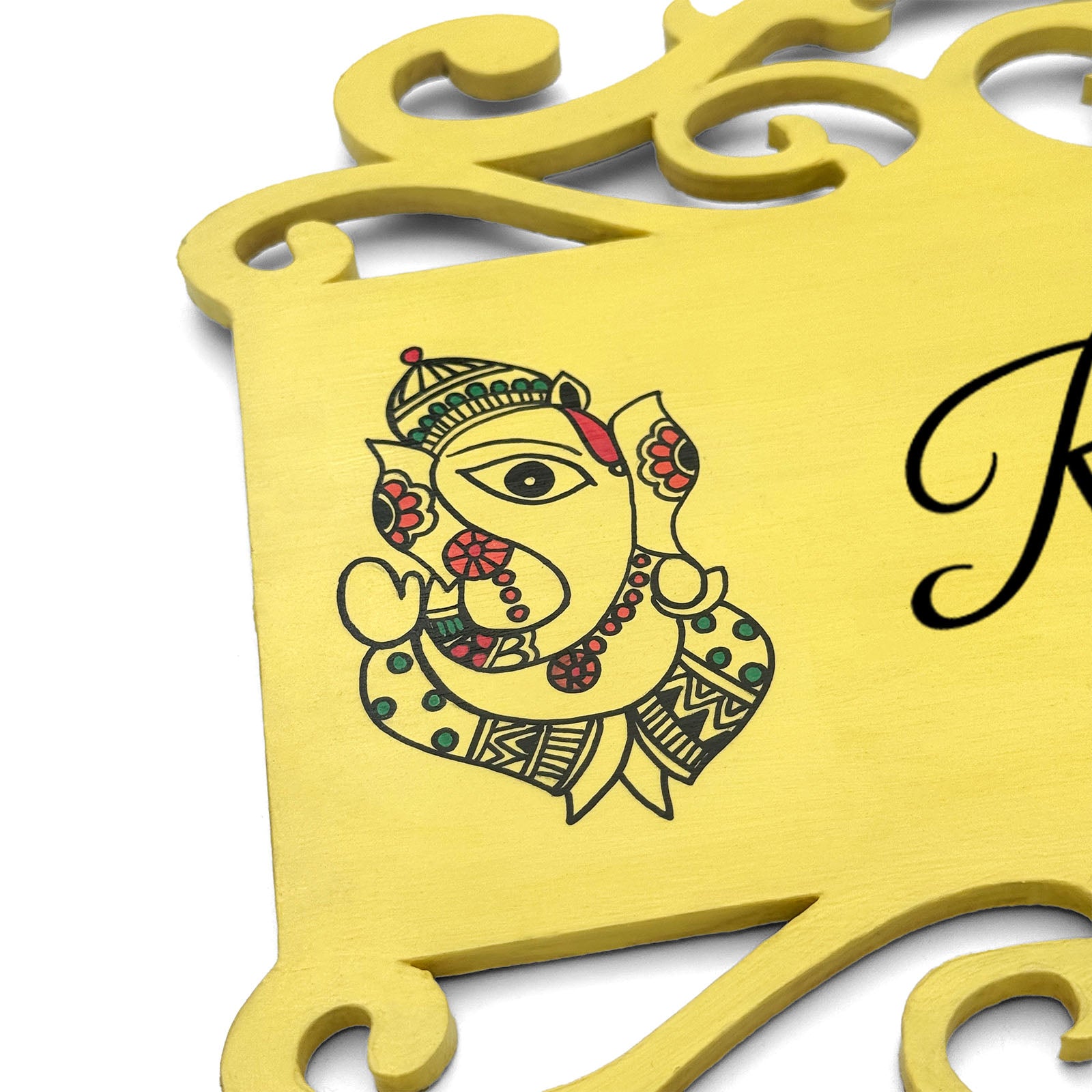 Ganesha Artwork Hand-Painted Wooden Madhubani Name Plate For Home