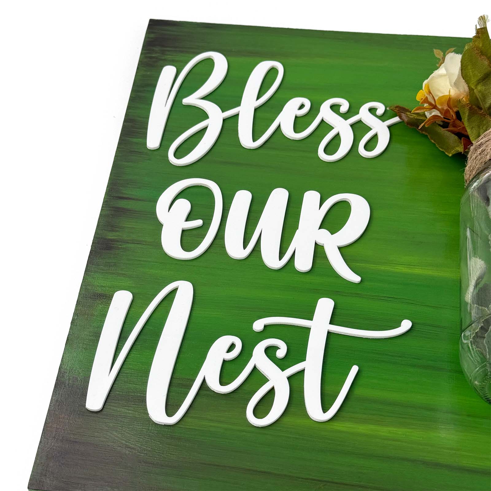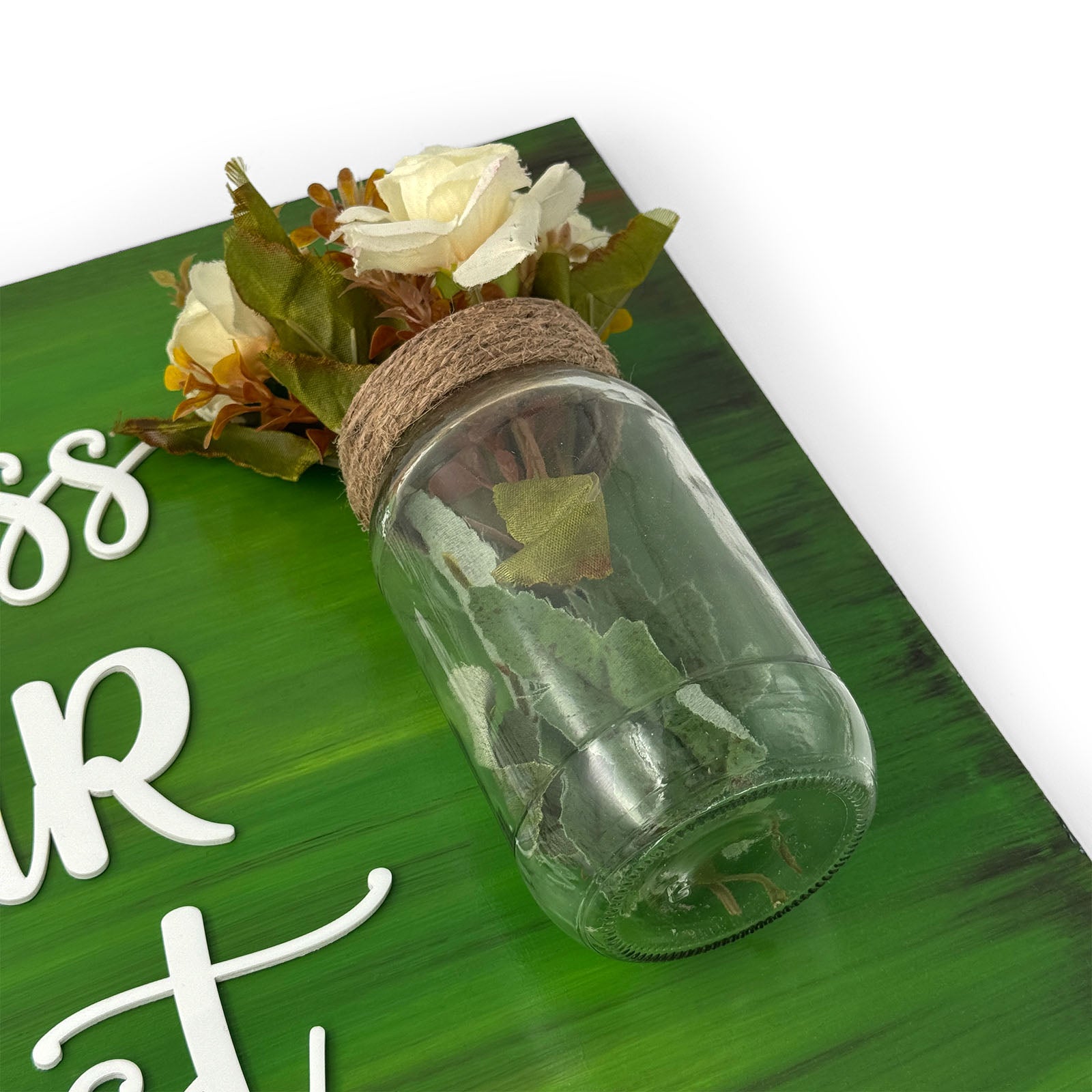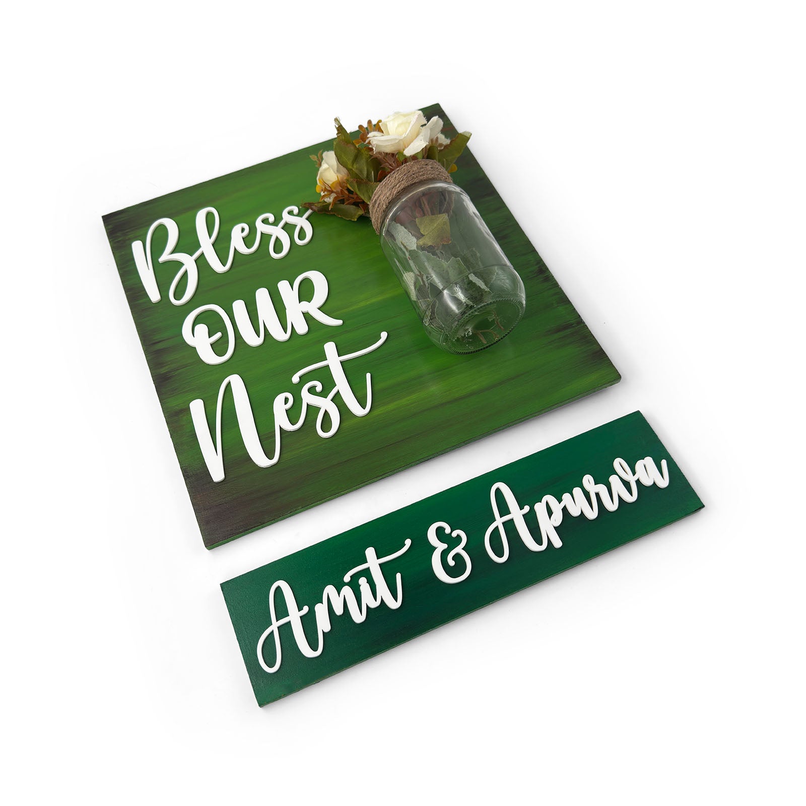 Green Hand-Painted Wooden Name Plate With Jar For Home - Jar Board & One Plank
