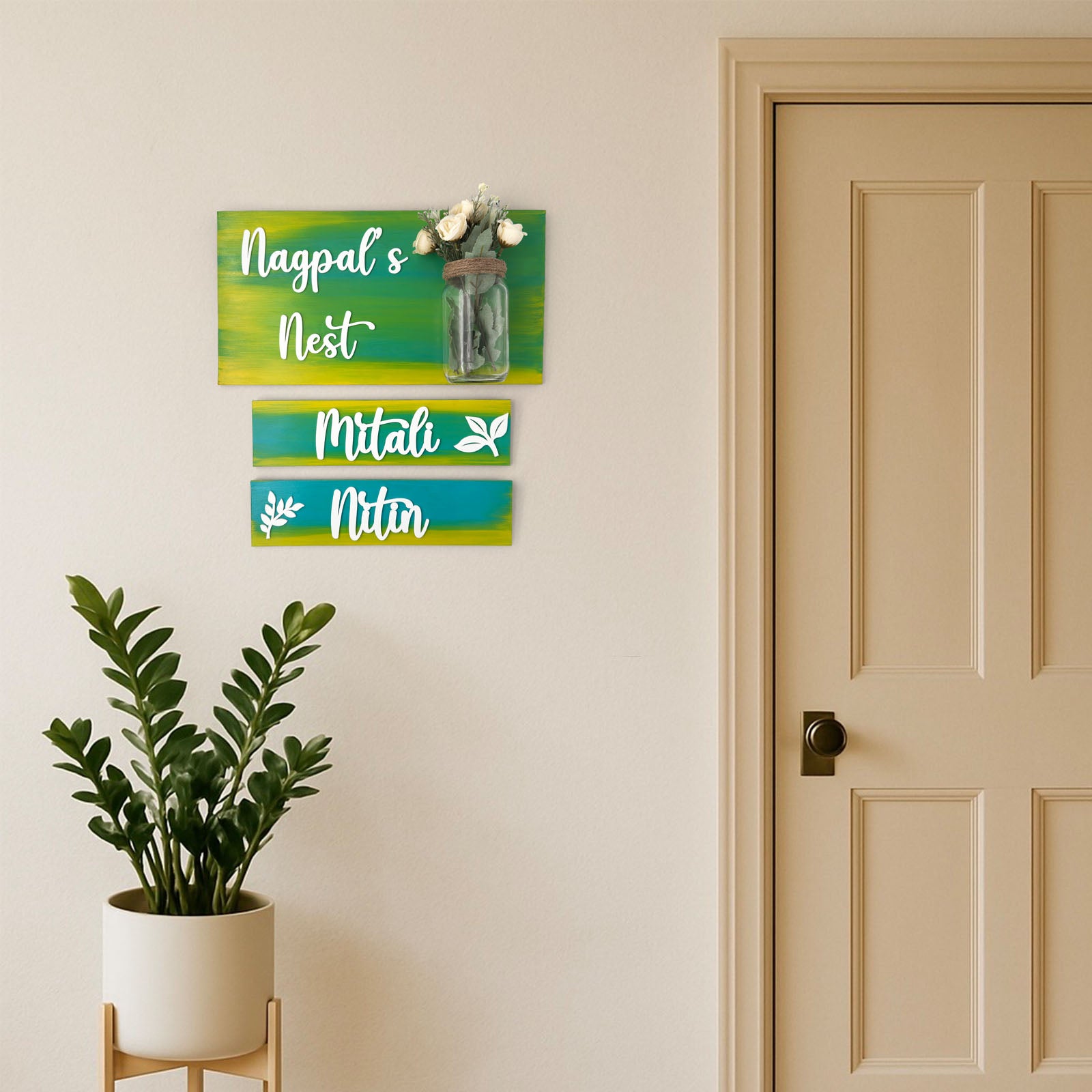 Hand-Painted Wooden Name Plate With Jar For Home - Jar Board & Two Planks