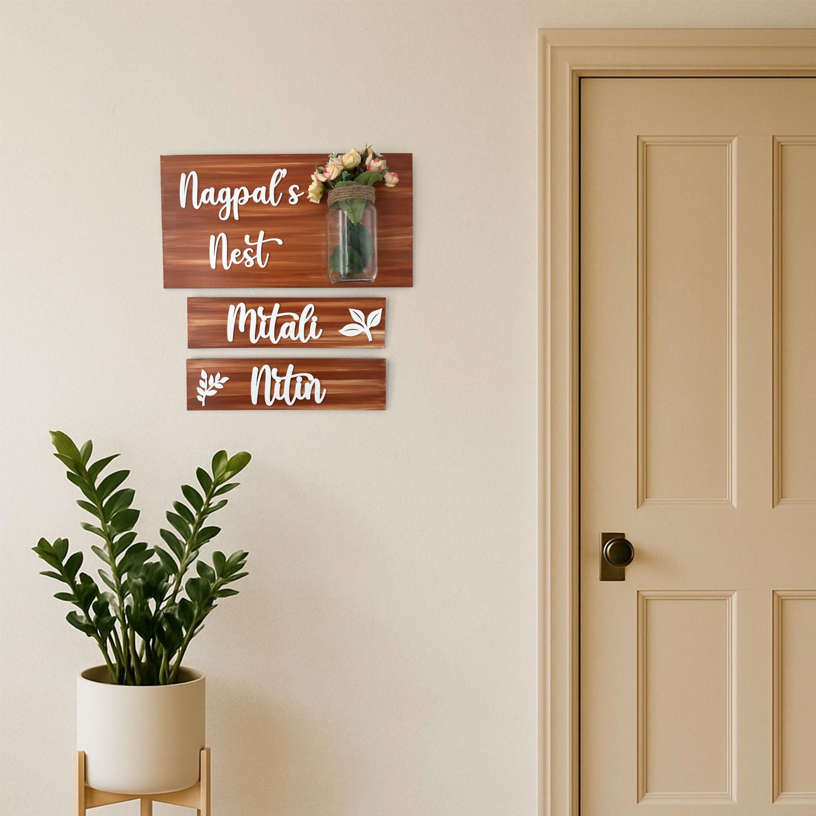 Three Plank Hand-Painted Wooden Name Plate For Home - Wooden Finish