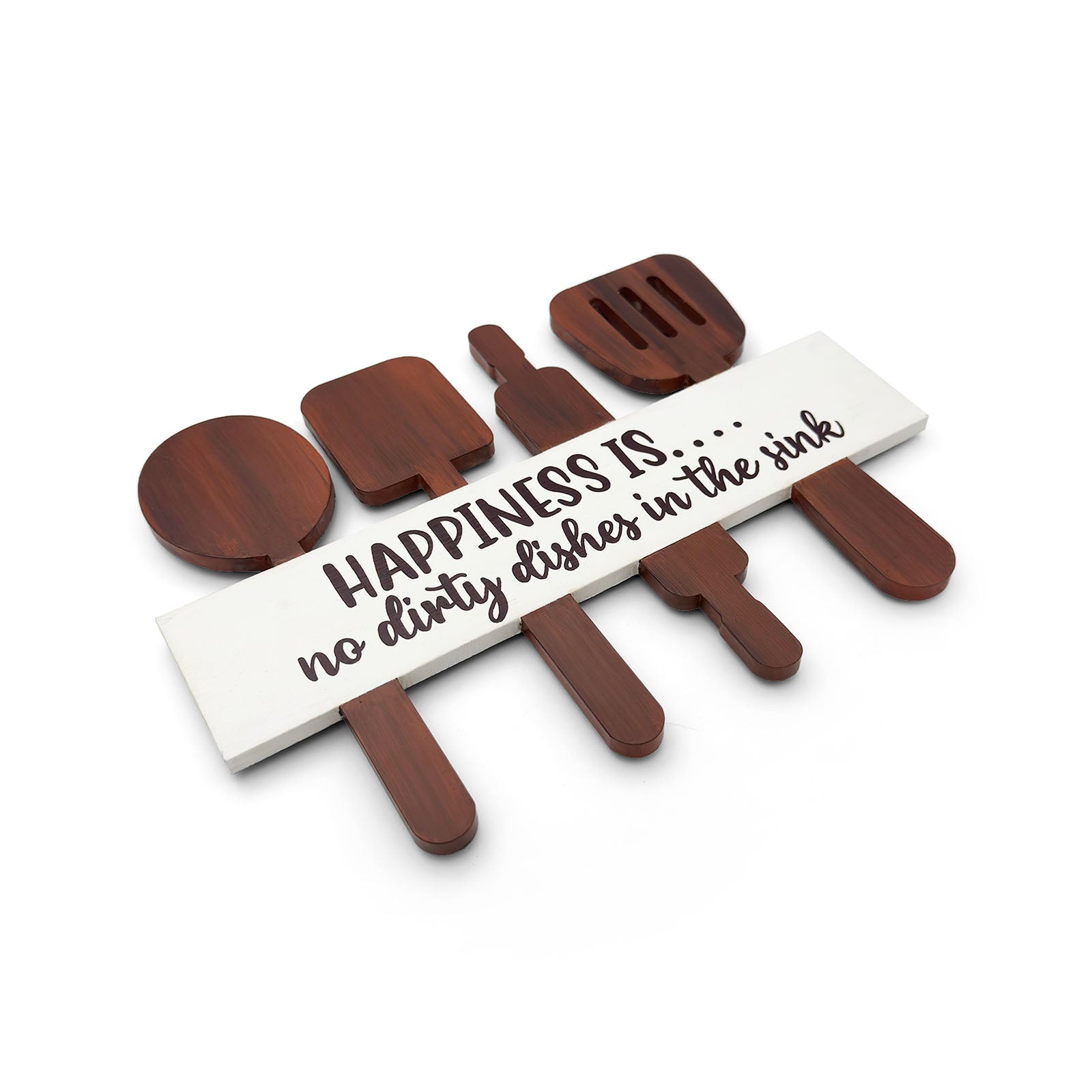Happiness Is No Dirty Dishes In The Sink Hand-Painted Wooden Utensil Board Kitchen Wall Hanging - Brown