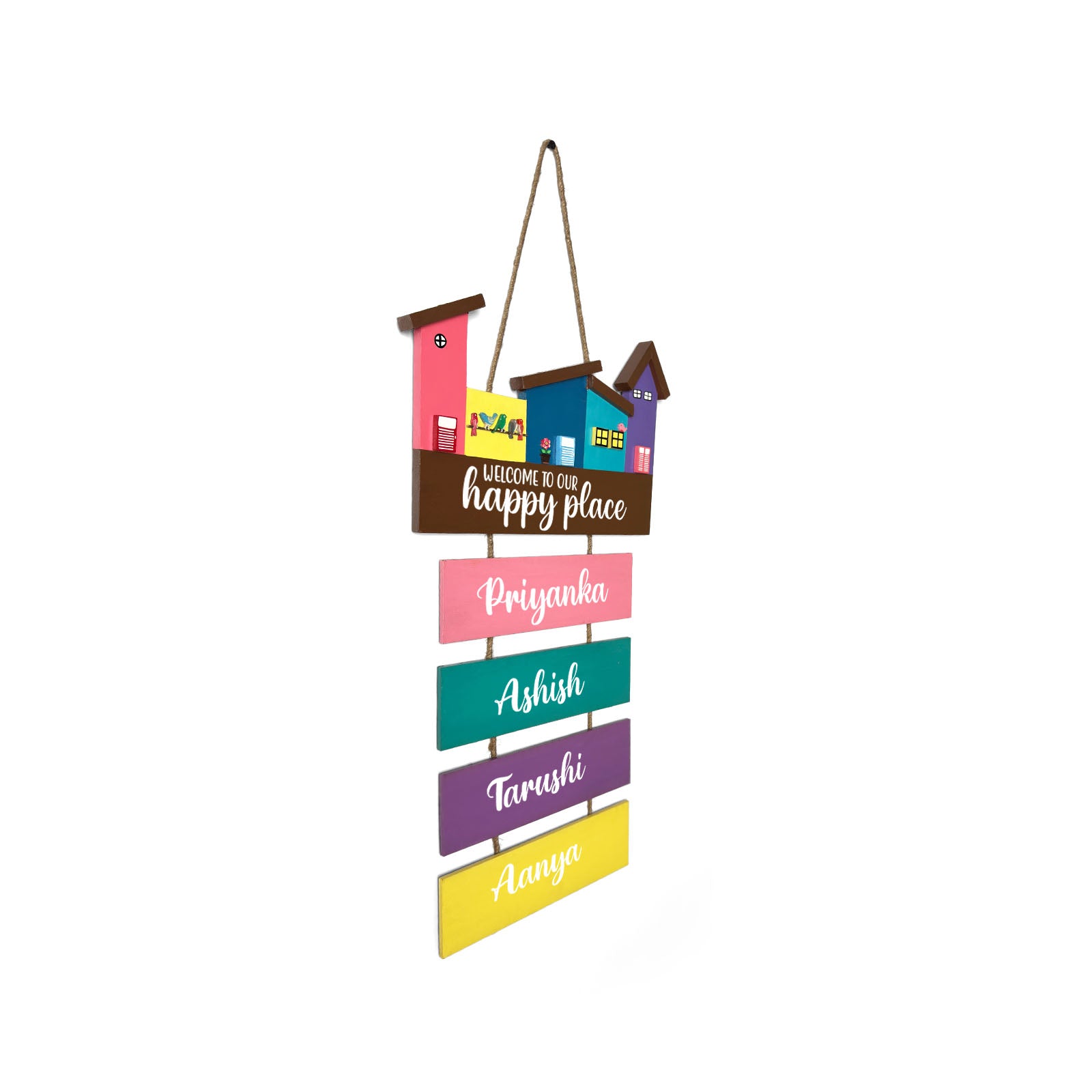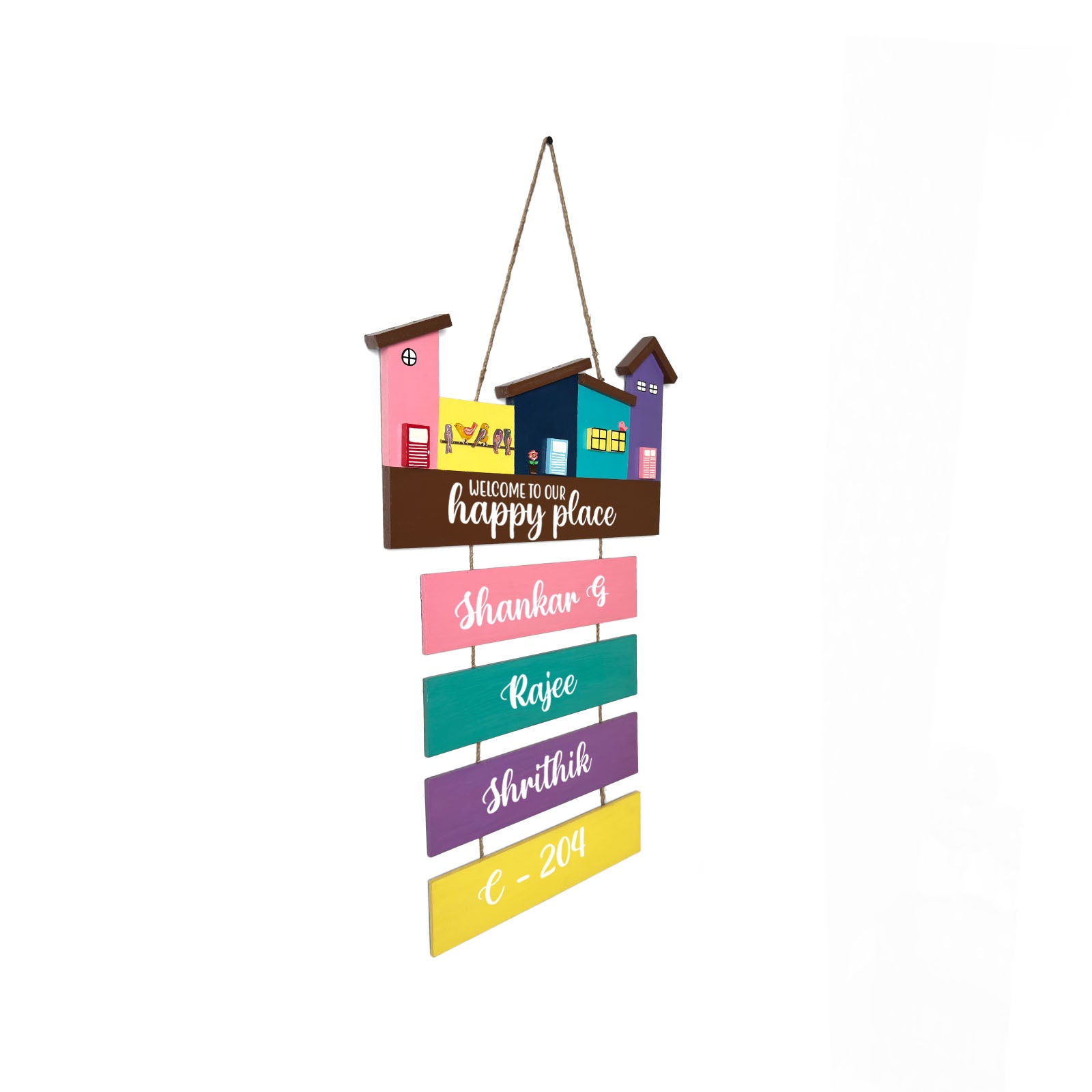 - Enhance your home’s entrance with our exquisite hand-painted wooden hut-shaped name plate.