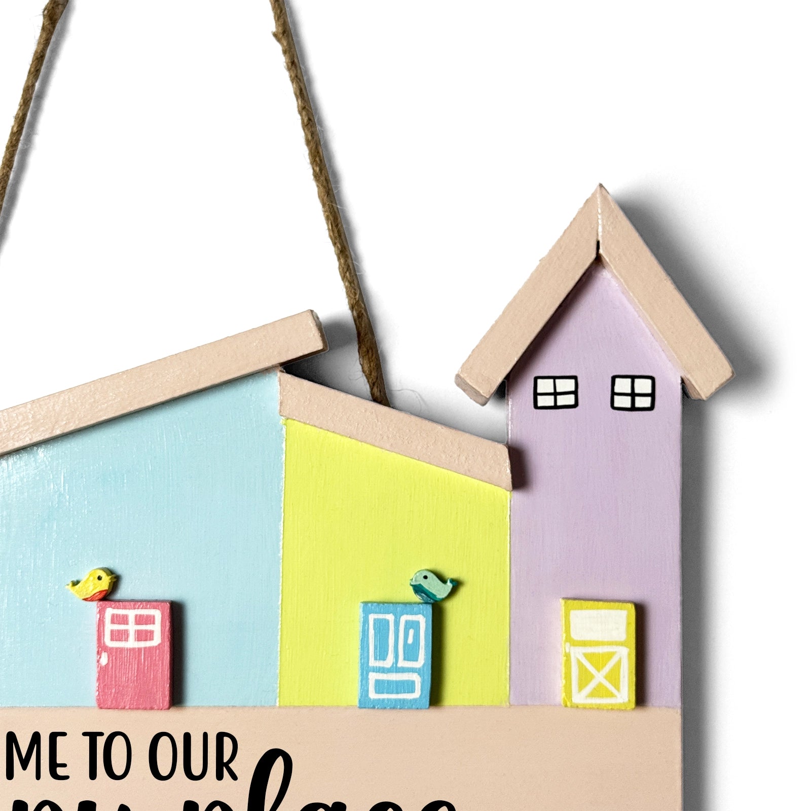 - Enhance your home’s entrance with our exquisite hand-painted wooden hut-shaped name plate.