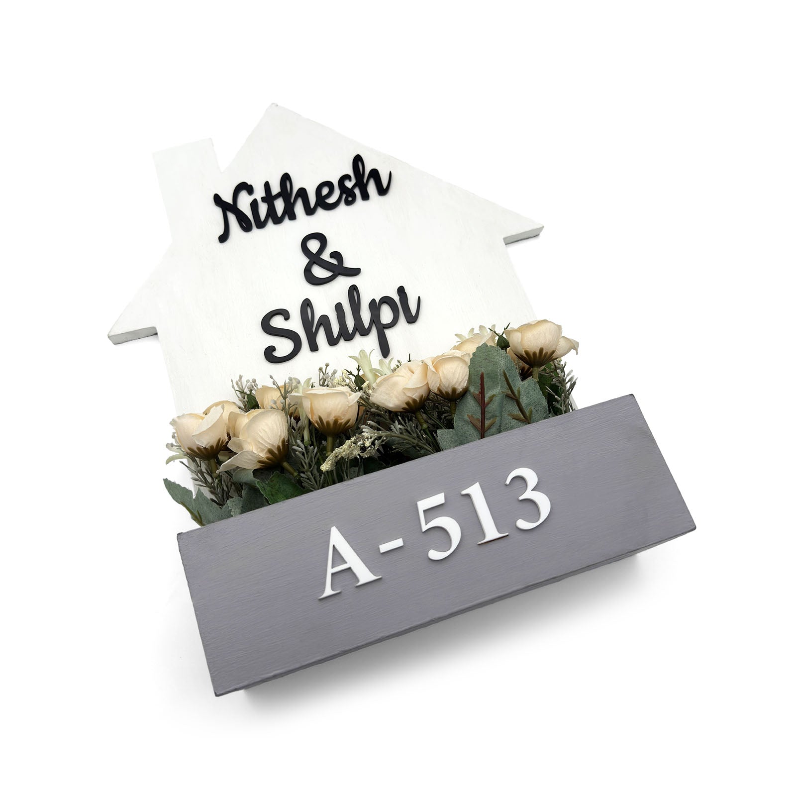 Hut-Shaped Hand-Painted Wooden Planter Name Plate For Home - White & Grey