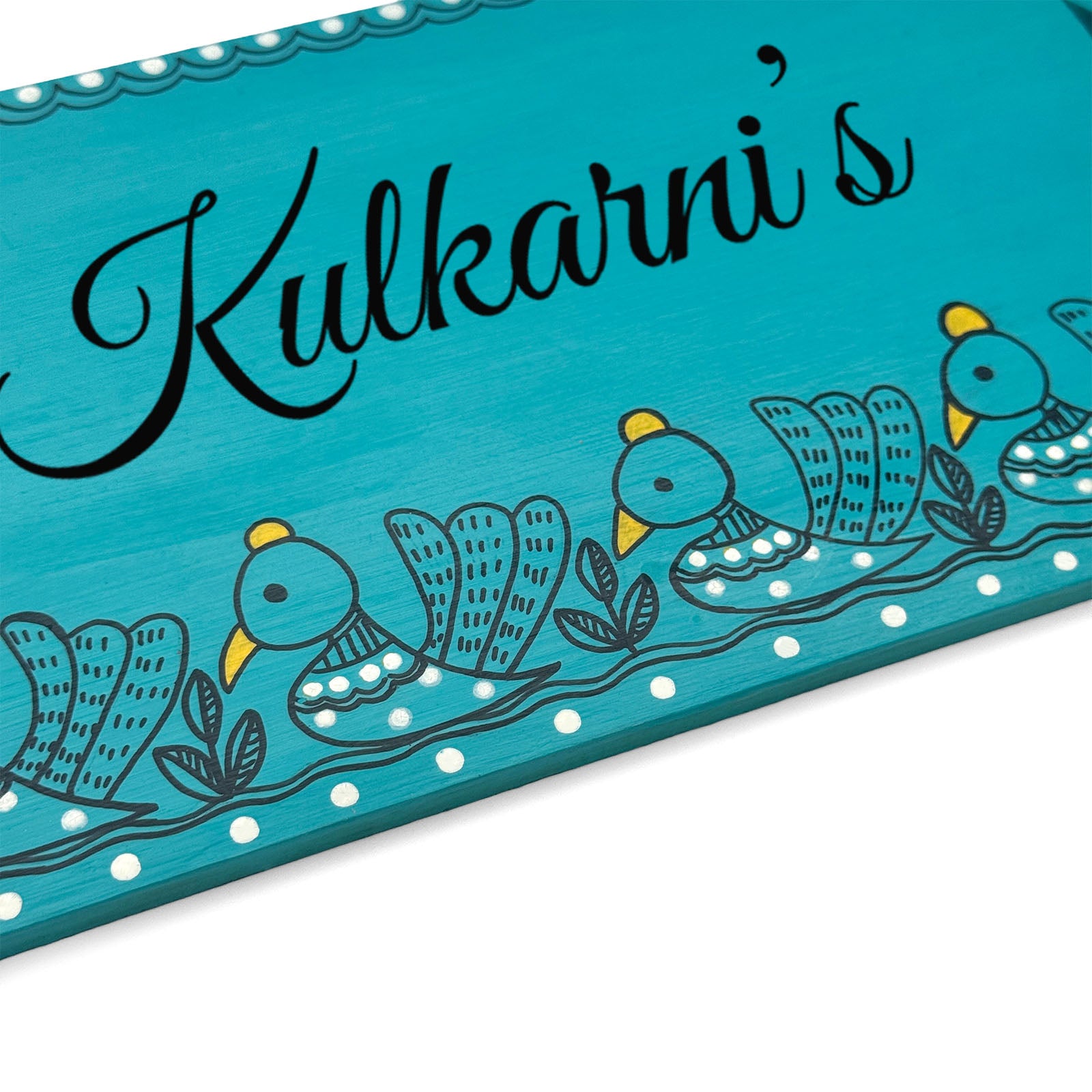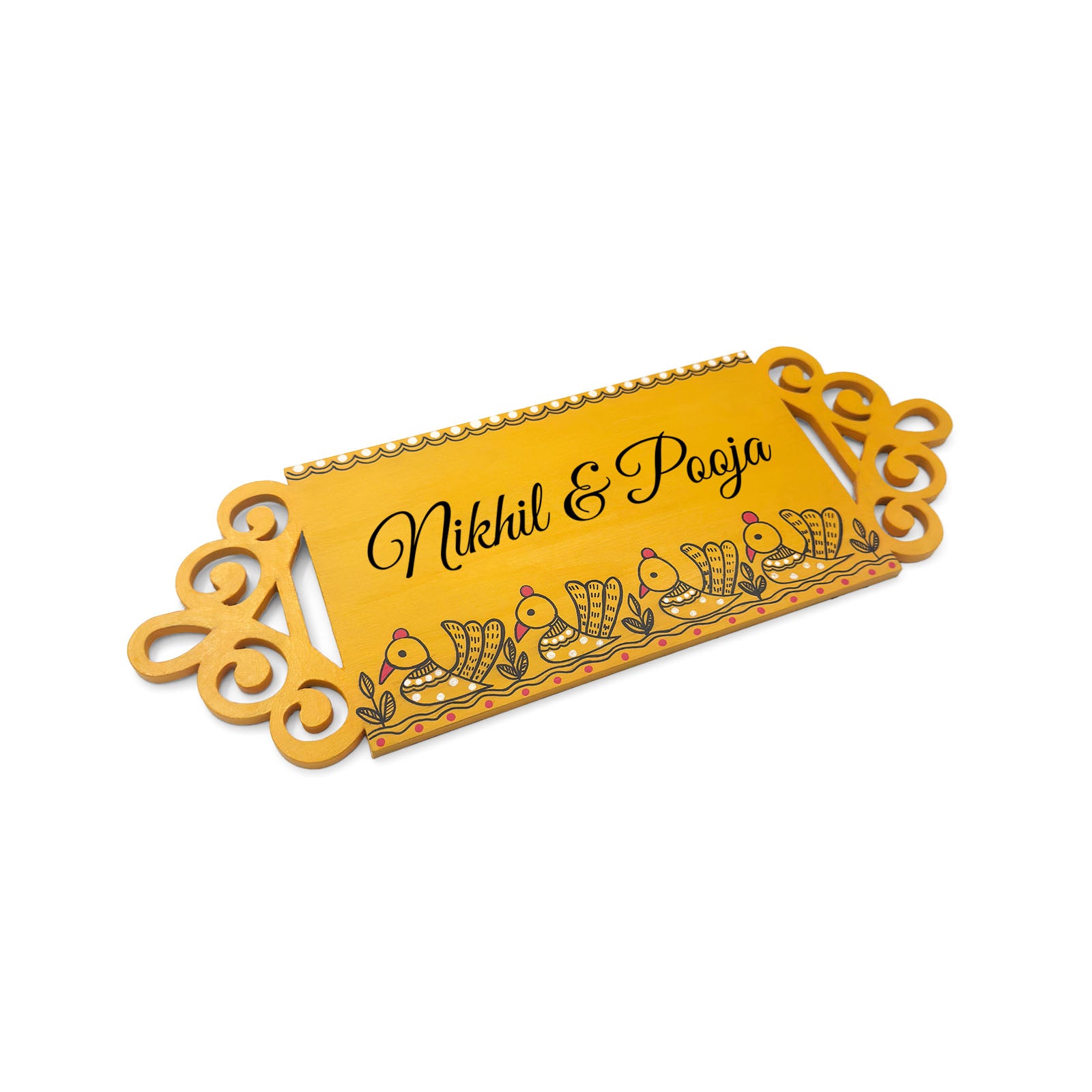 Peacock Artwork Hand-Painted Wooden Madhubani Name Plate For Home