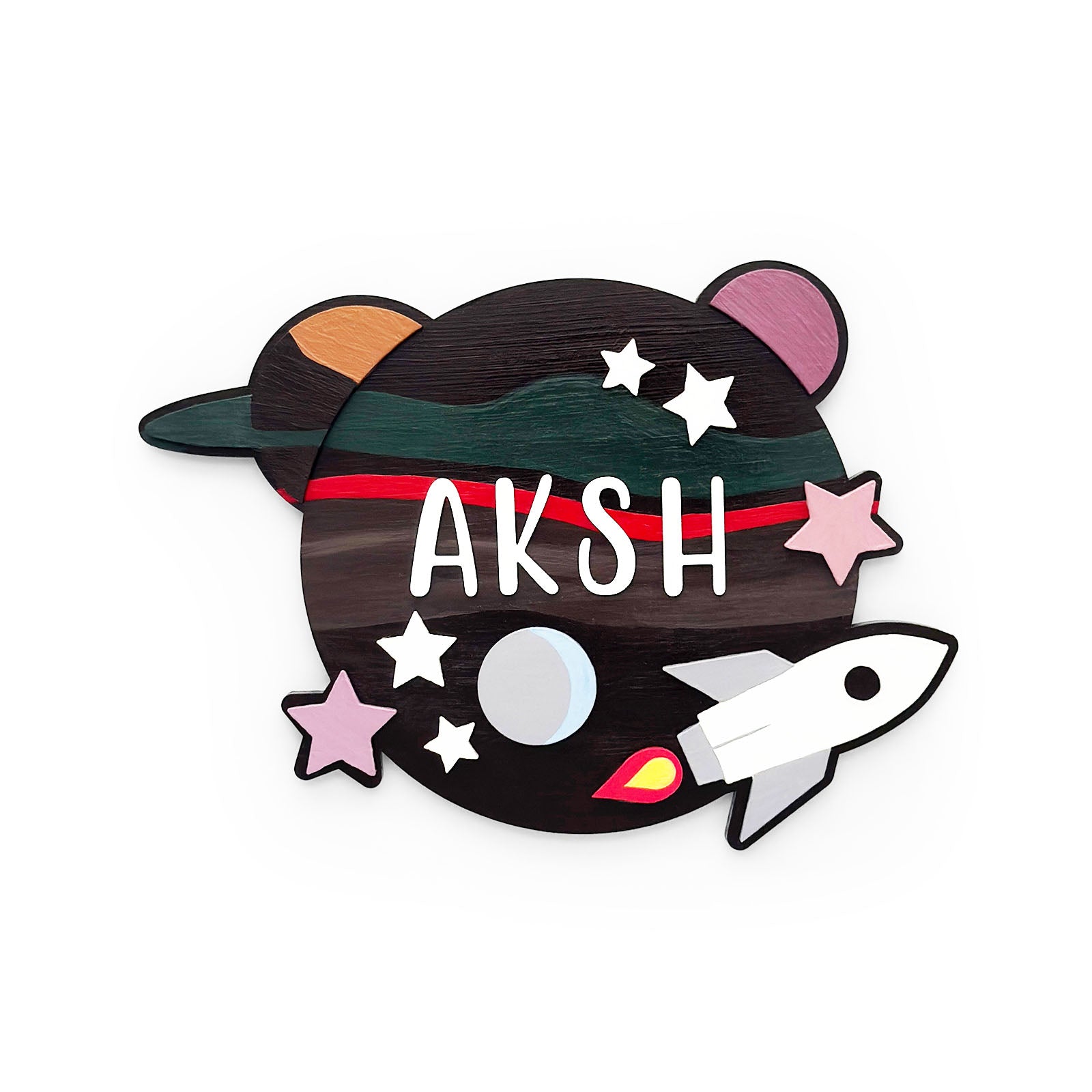 Space Themed Hand-Painted Wooden Kids Name Plate - Brown