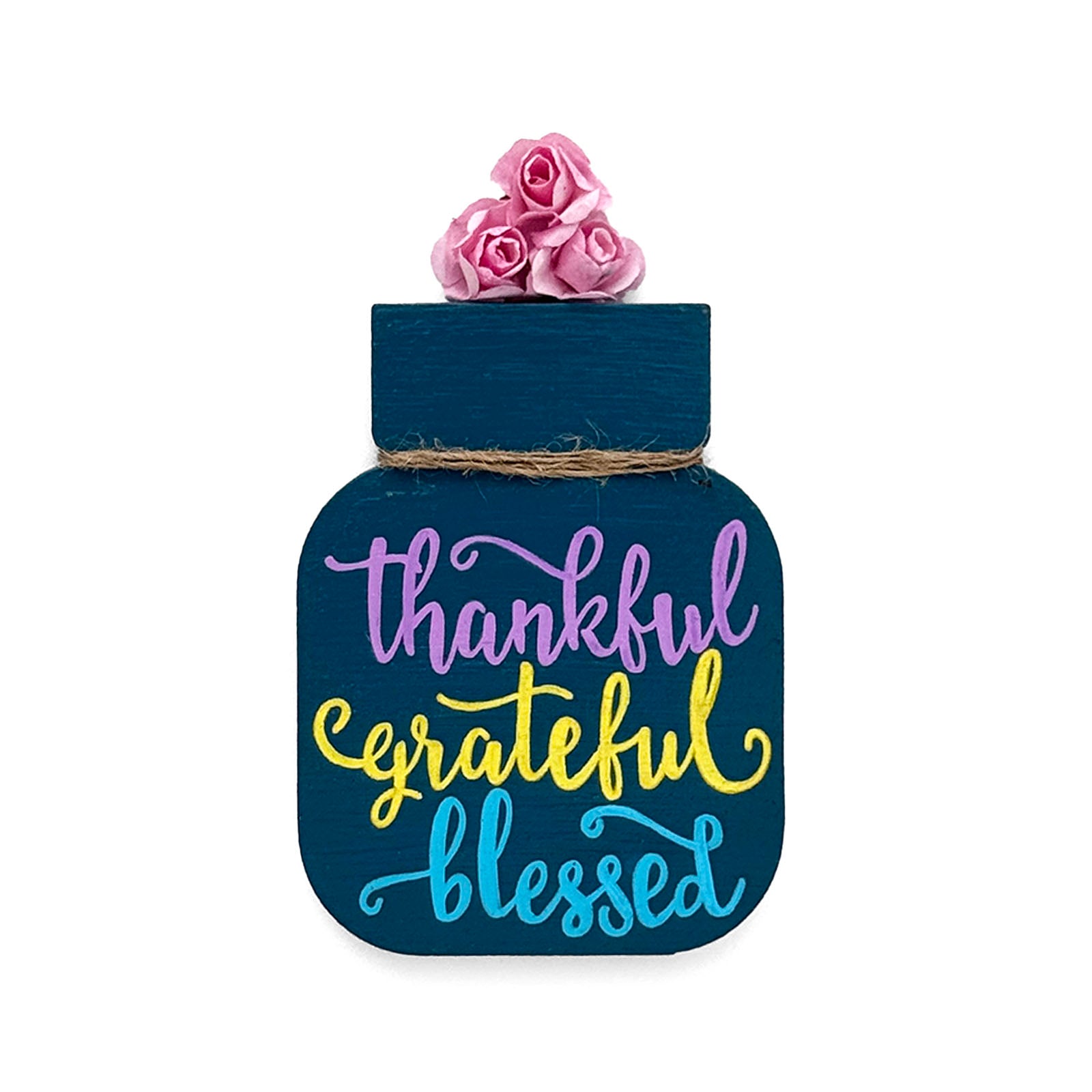 Thankful Grateful Blessed Hand-Painted Wooden Mason Jar Fridge Magnet - Dark Blue