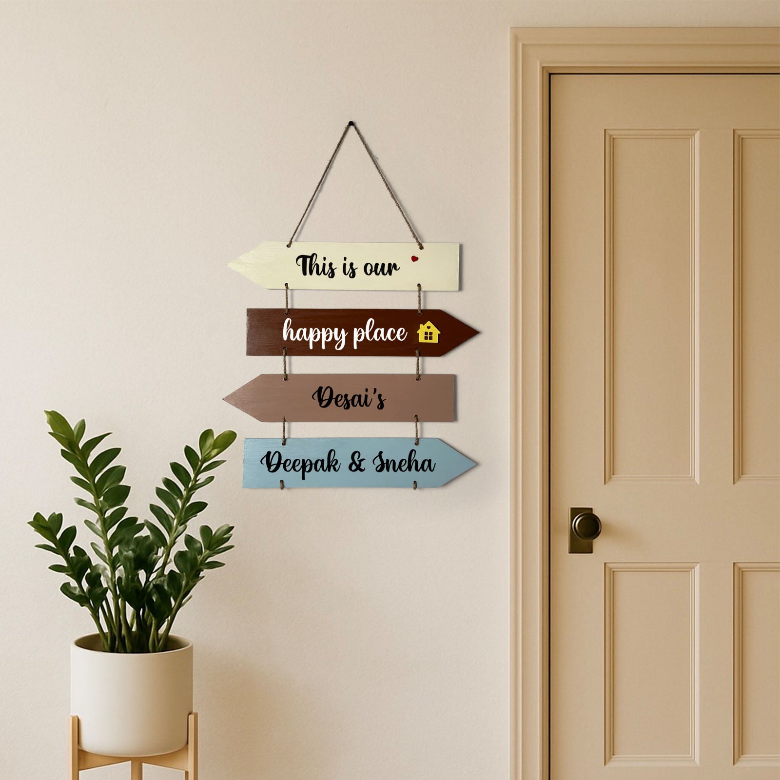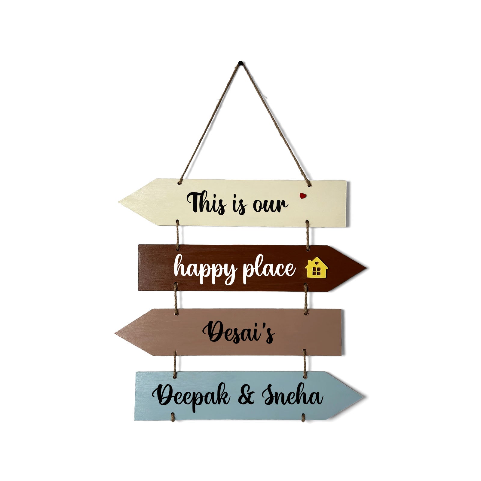 This Is Our Happy Place Hand-Painted Wooden Arrow Plank Name Plate For Home - Four Planks