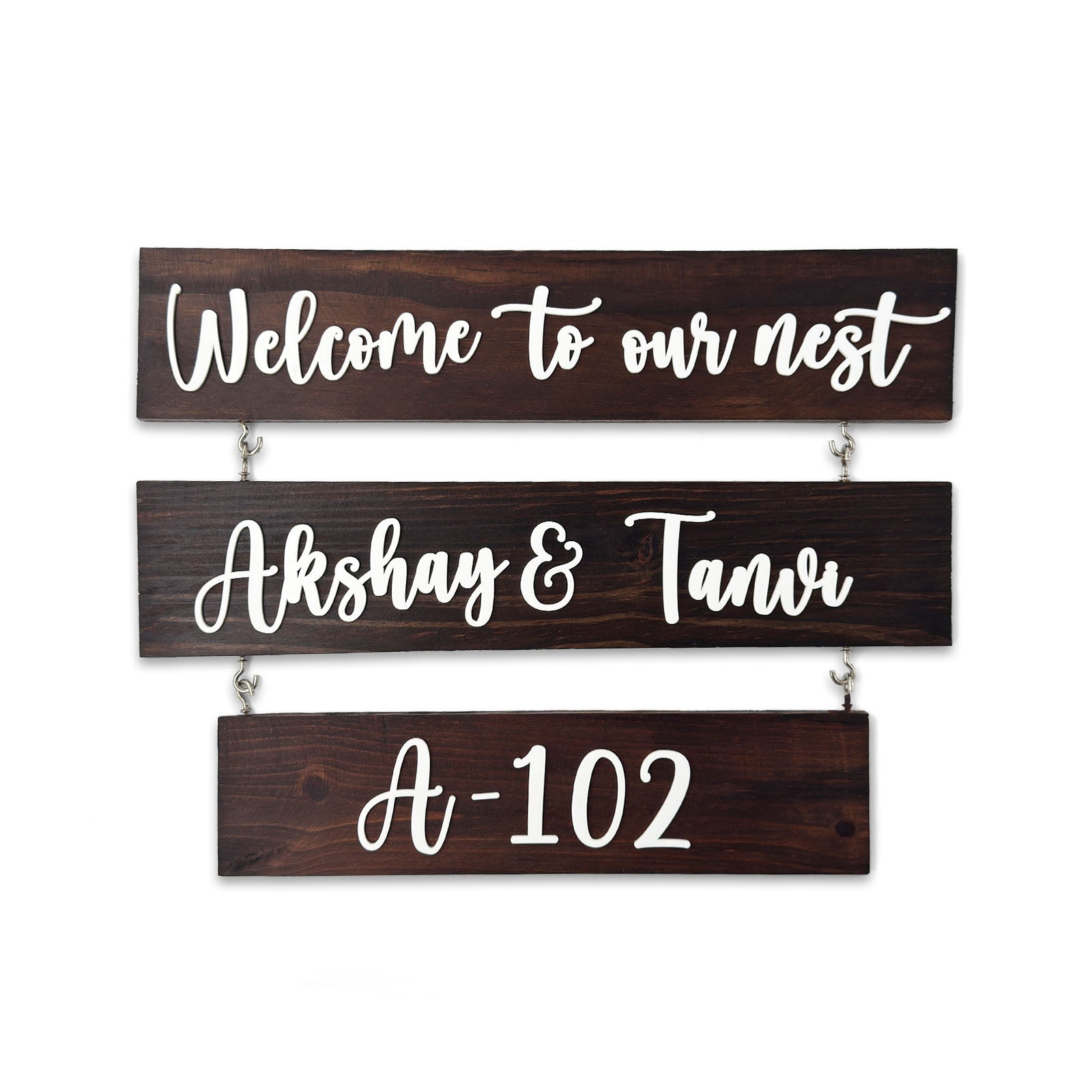 Three Plank Hand-Painted Wooden Name Plate For Home - Wooden Finish