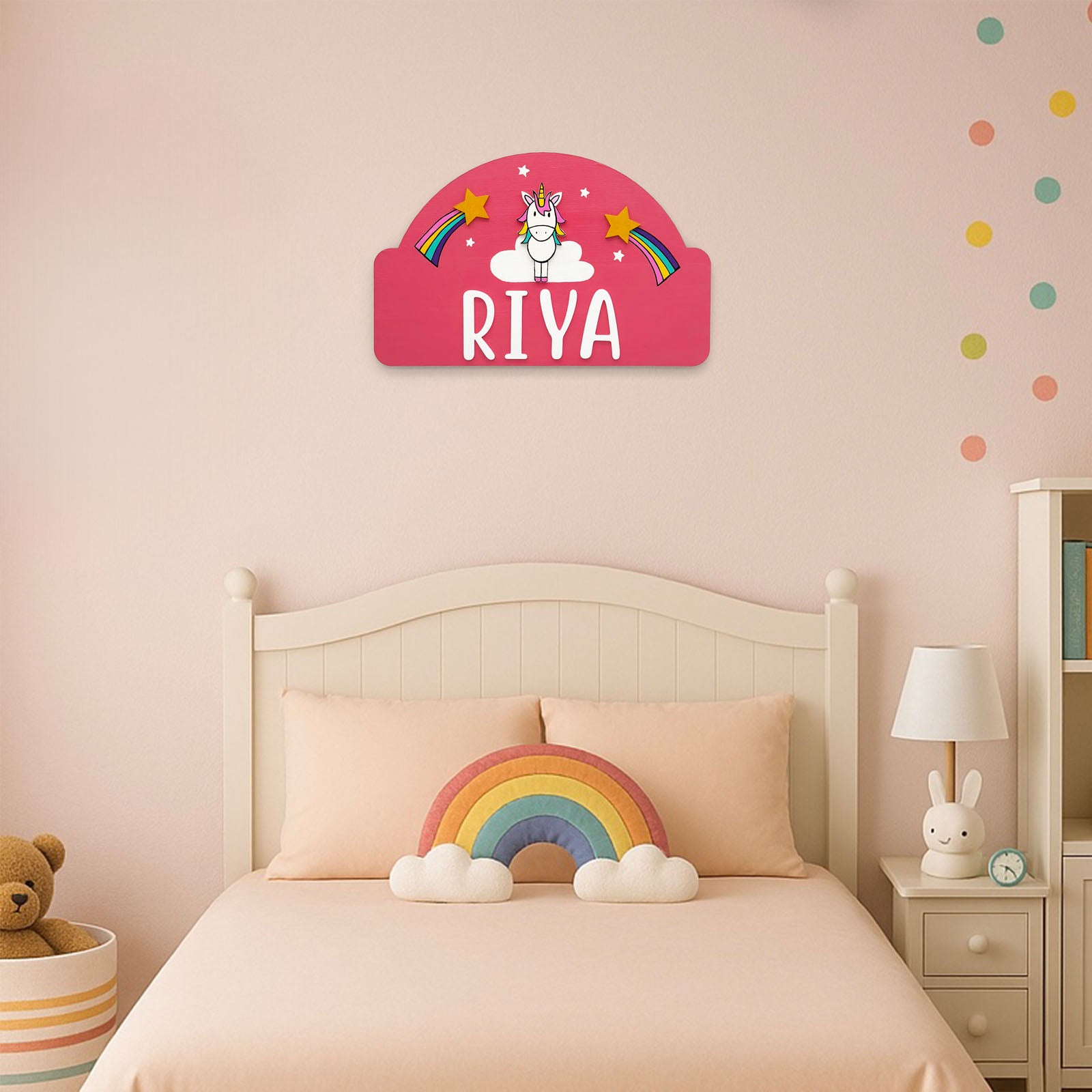 Unicorn Themed Hand-Painted Wooden Kids Name Plate - Pink