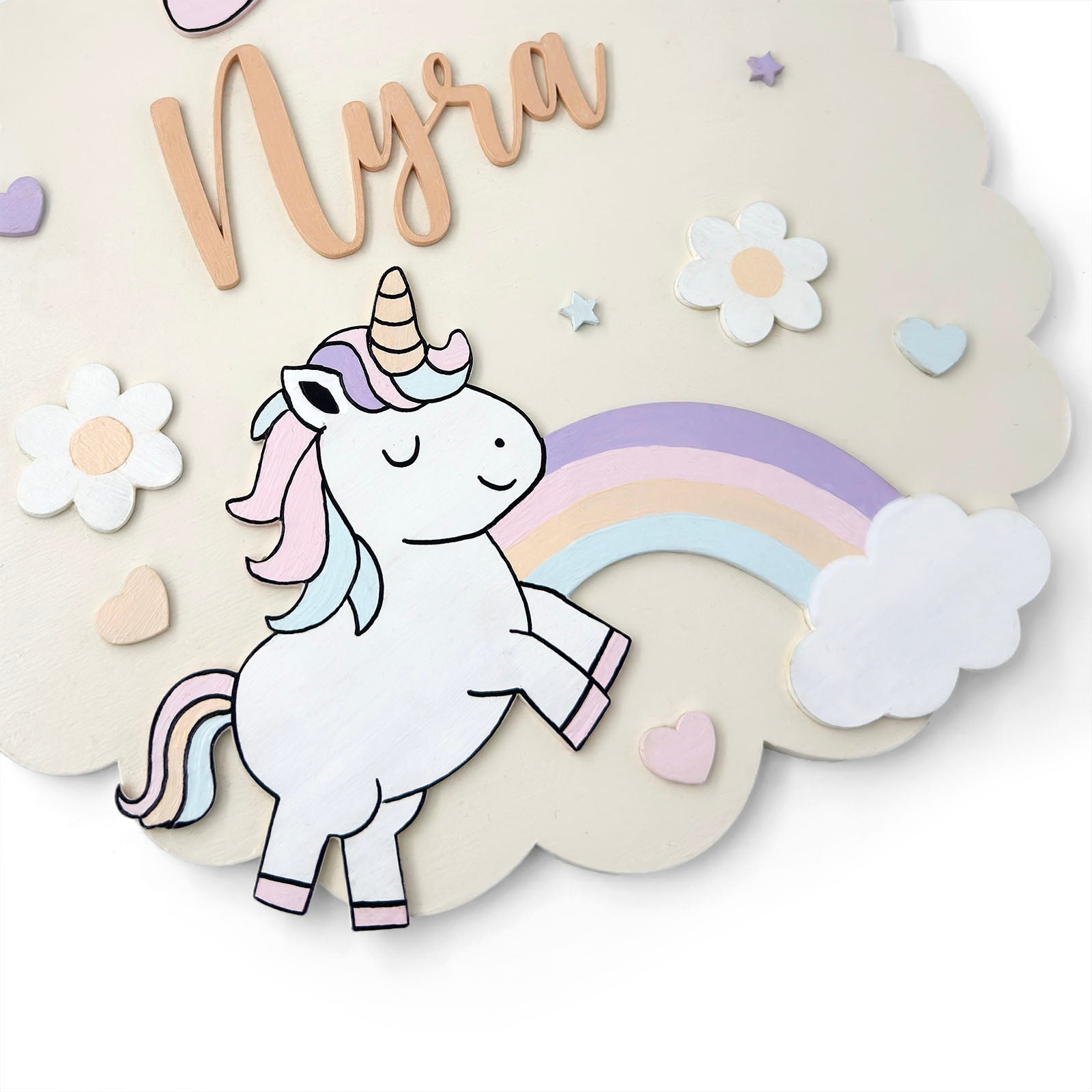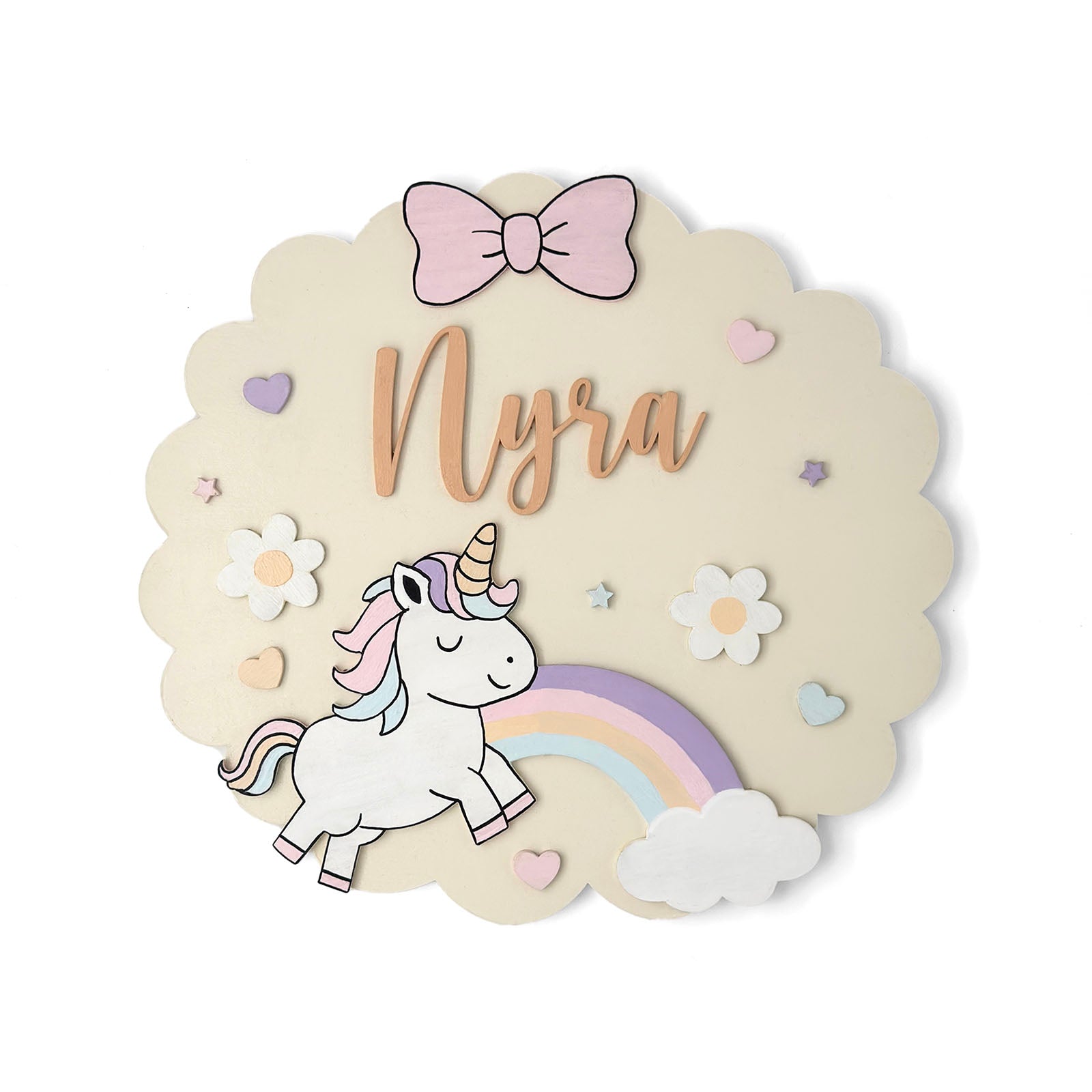 Unicorn Themed Hand-Painted Wooden Scalloped Cloud Kids Name Plate - Design 1