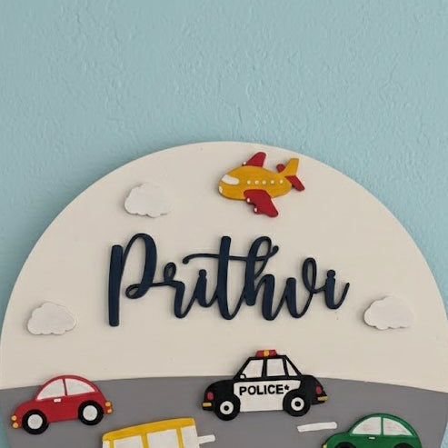Vehicles Themed Hand-Painted Wooden Roumd Kids Name Plate - Design 1